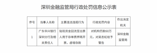 日前,国家金融监督管理总局深圳金融监管局发布行政处罚信息,广东华兴银行深圳分行及相关责任人,涉贴现资金回流至出票人用于存单质押再开票,虚增存款主要违法违规行为,监管对华兴银行深圳分行罚款60万元,对吴志虹给予警告。