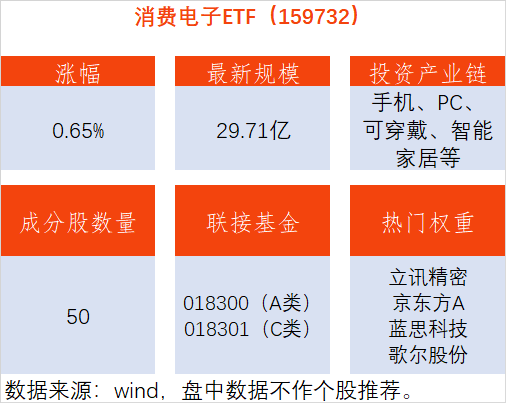 消费电子ETF(159732)跟踪国证消费电子指数,主要投资于业务涉及消费电子产业的50家A股上市公司,行业主要分布于电子制造、光学光电子等市场关注度较高的主流板块。