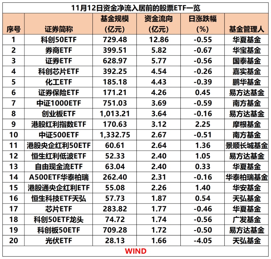 11月12日,三大指数小幅低开后震荡调整,保险、石油、银行等板块轮番演绎。股票ETF整体资金净流入91.6亿元,证券、化工、保险等相关热门主题ETF成为“吸金”主力,上证50指数、创业板50指数、中证A500指数等宽基ETF成为“失血”大户。