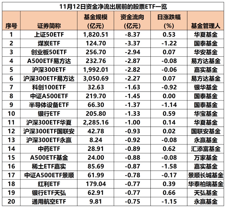 从单日资金净流出排行看,上证50ETF、创业板50ETF、A500ETF、沪深300ETF等宽基ETF产品成为“失血”大户。