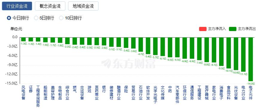 净流出方面,电子元件、电力行业、光伏设备等净流出排名靠前,其中电子元件净流出14.21亿元。