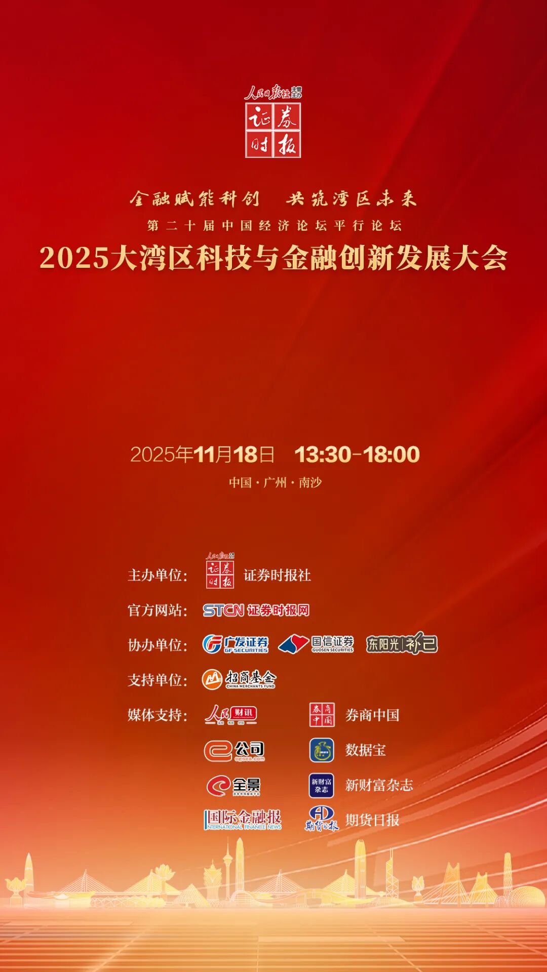 魅力湾区,南沙有约。第二十届中国经济论坛将于11月18日在位于粤港澳大湾区地理几何中心的南沙经济技术开发区拉开帷幕。作为本届论坛的重要组成部分,由证券时报社主办的平行论坛——“2025大湾区科技与金融创新发展大会”,将于当日下午13:30至18:00举行。届时,来自大湾区的政府部门、上市公司、金融机构及行业专家等200余位代表将齐聚一堂,围绕科技创新政策、金融赋能科创、“十五五”规划等议题展开深入交流。