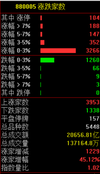 全市场共有3953只个股上涨,104只个股涨停,1338只个股下跌,无个股跌停。