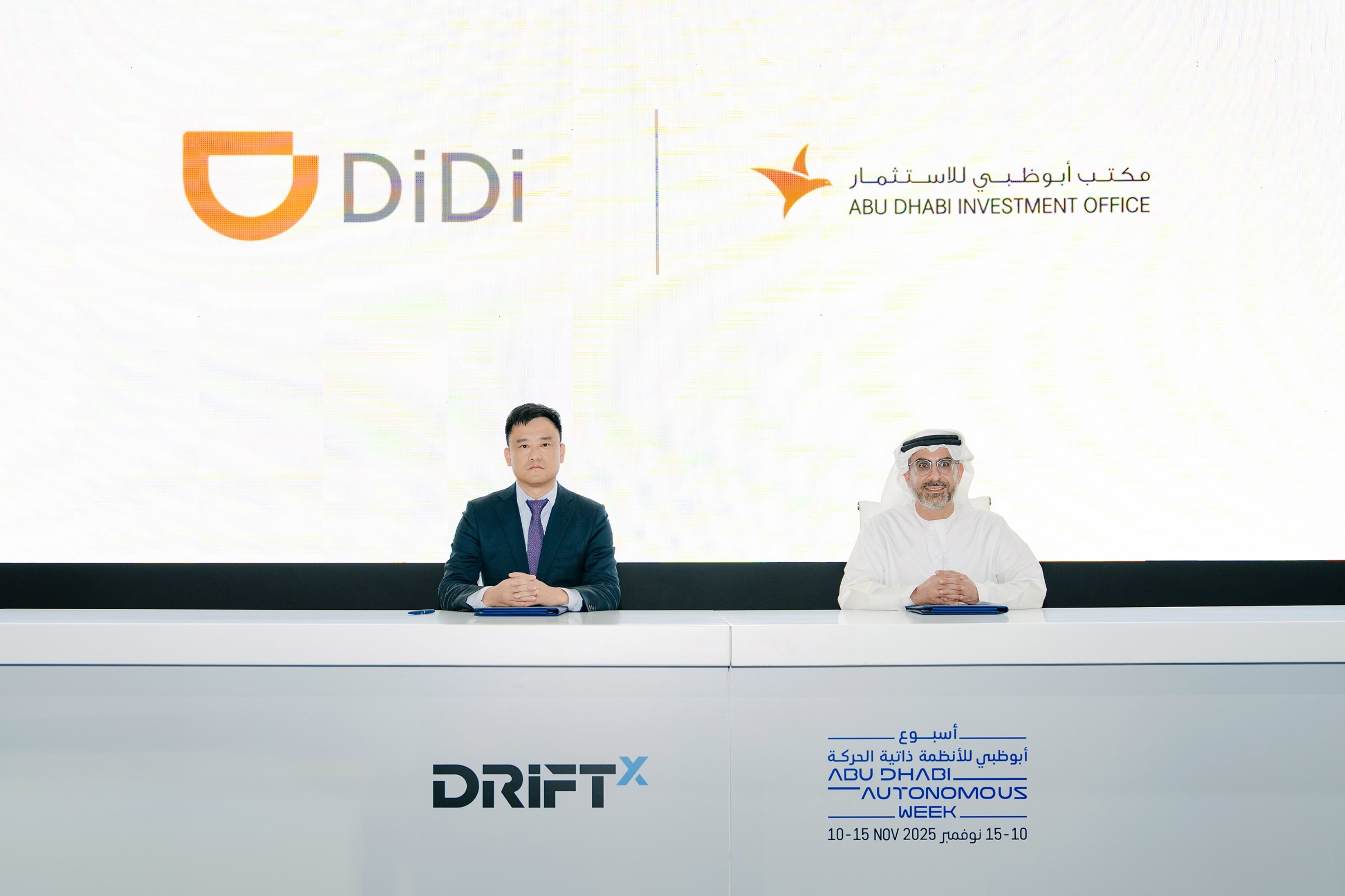 滴滴联合创始人、滴滴自动驾驶CEO张博(左)与阿布扎比投资办公室总干事H.E. Badr Al-Olama(右)代表签约