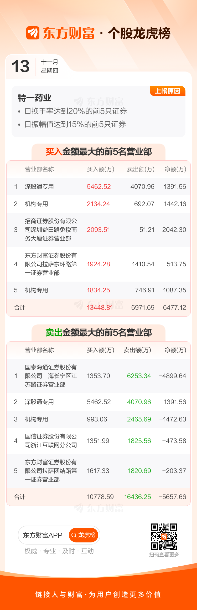交易所2025年11月13日公布的交易公开信息显示,特一药业因成为日换手率达到20%的前5只证券、日振幅值达到15%的前5只证券上榜。特一药业当日收报13.83元,涨跌幅3.13%,偏离值43.07%,换手率37.94%,成交额18.94亿。