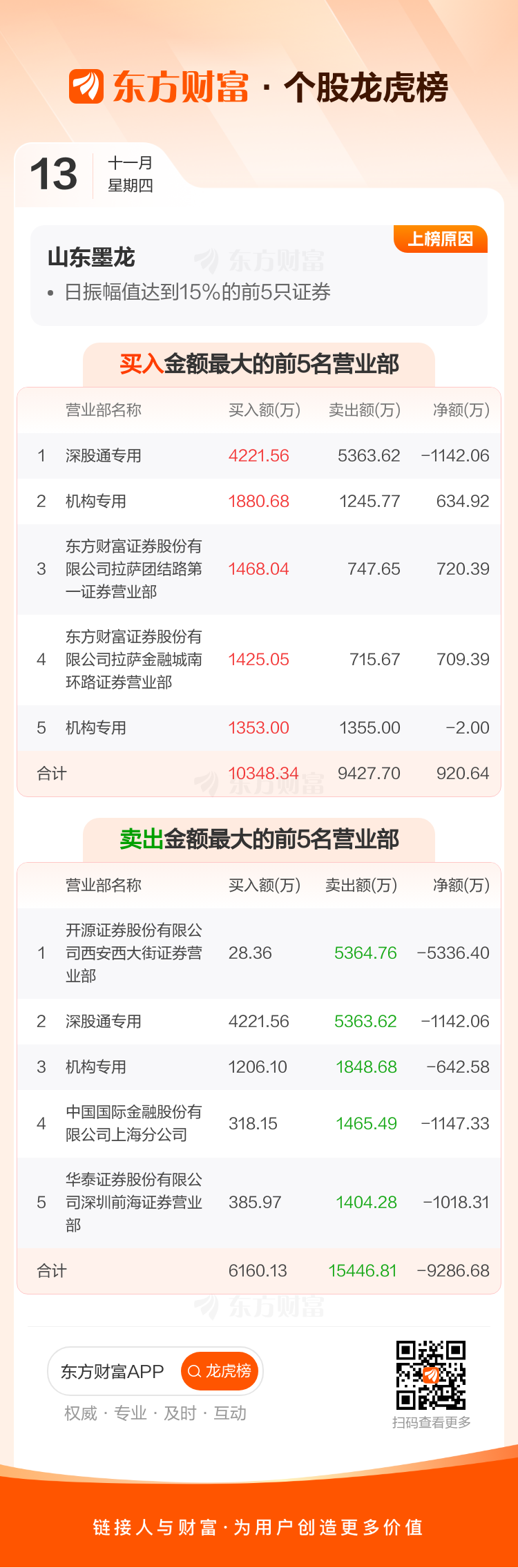 交易所2025年11月13日公布的交易公开信息显示,山东墨龙因成为日振幅值达到15%的前5只证券上榜。山东墨龙当日收报8.45元,涨跌幅5.23%,偏离值17.02%,换手率32.03%,成交额13.86亿。