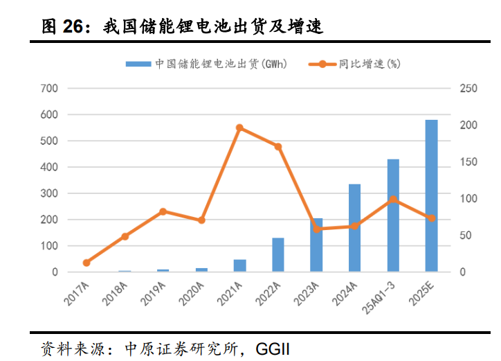 而动力与储能电池侧是提振锂电池需求的重要原因。中原证券研报显示,2025 年 1-9 月,我国新能源汽车销售 1119.60 万辆,同比增长 34.55%,合计占比 46.03%,其中出口175.80 万辆,同比增长 89.4%;我国动力和其他电池合计产量1121.90GWh,同比增长 51.40%,其中出口 199.90GWh,出口占累计销量的 18.7%。 2025 年前三季度, 我国储能锂电池合计出货 430GWh,同比增长 99.07%。