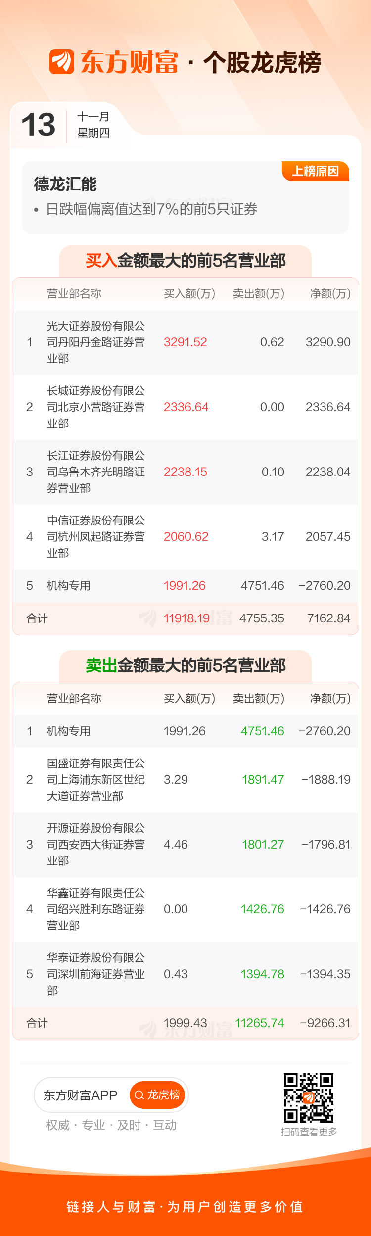 交易所2025年11月13日公布的交易公开信息显示,德龙汇能因成为日跌幅偏离值达到7%的前5只证券上榜。德龙汇能当日收报10.5元,涨跌幅-8.22%,偏离值-9.75%,换手率23.99%,成交额9.03亿。