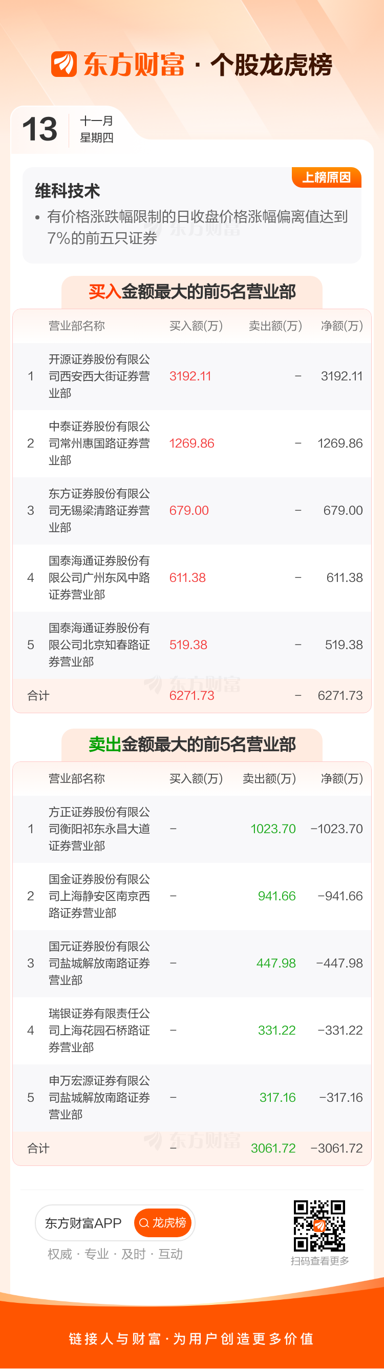 交易所2025年11月13日公布的交易公开信息显示,维科技术因成为有价格涨跌幅限制的日收盘价格涨幅偏离值达到7%的前五只证券上榜。维科技术当日收报7.88元,涨跌幅10.06%,偏离值9.32%,换手率5.08%,成交额2.09亿。