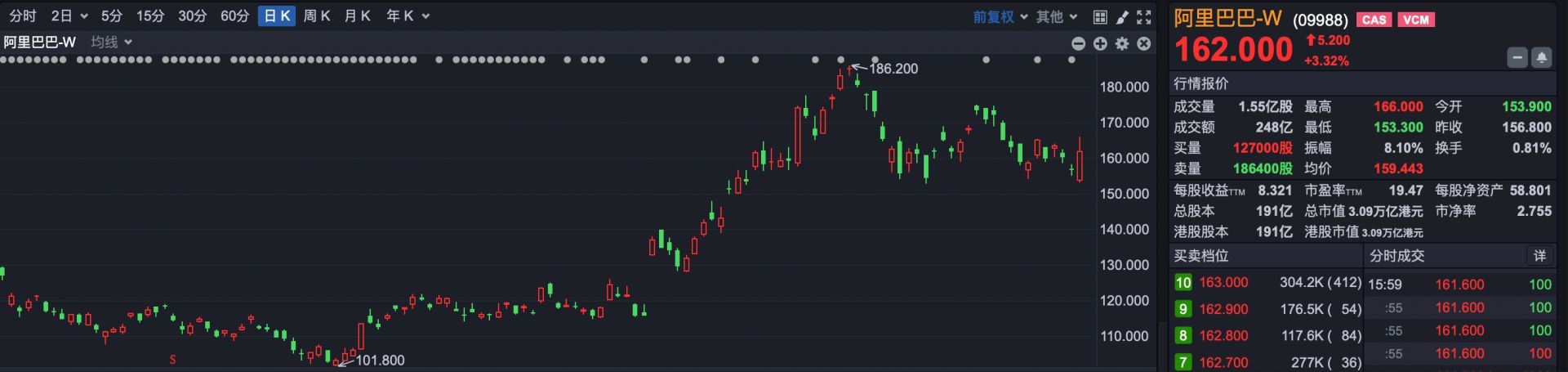 今天行情的突发异动,主要源自阿里巴巴-W(09988.HK)午后的飙升。