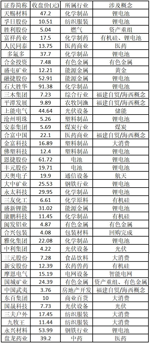 涨停板个股中,股价创出近一年新高的个股有41只(不包括创出历史新高的个股),包括天赐材料、孚日股份、胜利股份、富祥药业、人民同泰、多氟多、合金投资、盛屯矿业、融捷股份、石大胜华、三木集团、平潭发展、上能电气、沧州明珠、安泰集团、合富中国、金富科技、佛塑科技、恩捷股份、丰元股份、天奥电子、大中矿业、永太科技、三友化工、盛新锂能、康鹏科技、闽发铝业、合兴包装、雅化集团、中利集团、三元股份、新安股份、摩恩电气、国城矿业、中国武夷、东百集团、国晟科技、三夫户外、九牧王、永兴材料、盘龙药业,具体如下表所示。