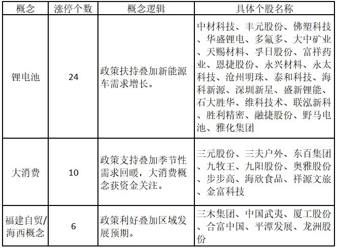 从概念特征来看,今日涨停板个股中,锂电池、大消费、福建自贸/海西概念的个股最多。