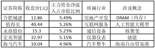 主力资金净流入金额占市值比例排名前5的个股分别为合肥城建、值得买、永鼎股份、宏英智能、海马汽车。