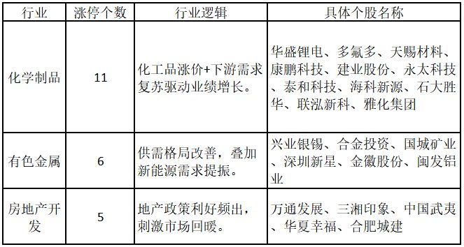 从行业特征来看,今日涨停板个股中,化学制品、有色金属、房地产开发行业的个股最多。