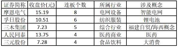 从连板情况来看,今日首板个股有67只;2连板的个股有7只;3连板及以上的个股有11只。今日连板数排名前5的个股包括摩恩电气、孚日股份、三木集团、人民同泰、三元股份,具体如下表所示。