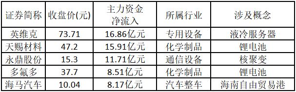 从主力资金来看,今日涨停板个股中,主力资金净流入金额排名前5的个股分别为英维克、天赐材料、永鼎股份、多氟多、海马汽车。
