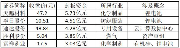 从封板资金来看,今日涨停板个股中,封板资金排名前5的个股包括天赐材料、孚日股份、速达股份、胜利股份、富祥药业。