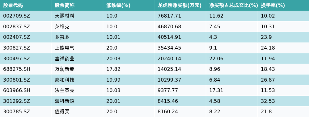 南财智讯11月13日电,南财金融终端数据显示,因当日异动登上龙虎榜的个股中,资金净买入最多的前三位分别是天赐材料(002709.SZ)、英维克(002837.SZ)与多氟多(002407.SZ)。其中排名第一的天赐材料净买额达7.68亿元,占总成交金额的11.62%。天赐材料当日收盘上涨10.0%,换手率为10.02%,净买入额前10个股详情见下图:
