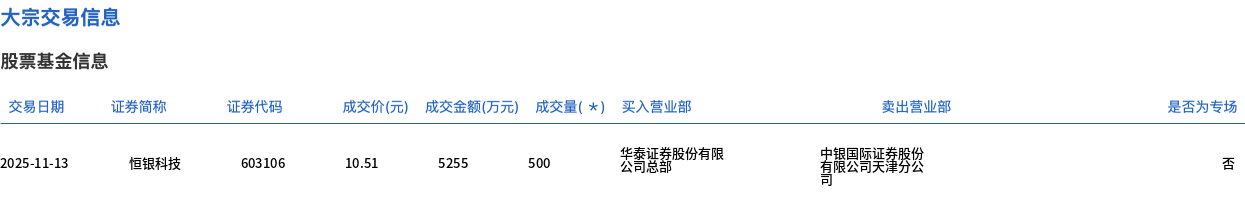 恒银科技今日大宗交易折价成交500万股,成交额5255万元