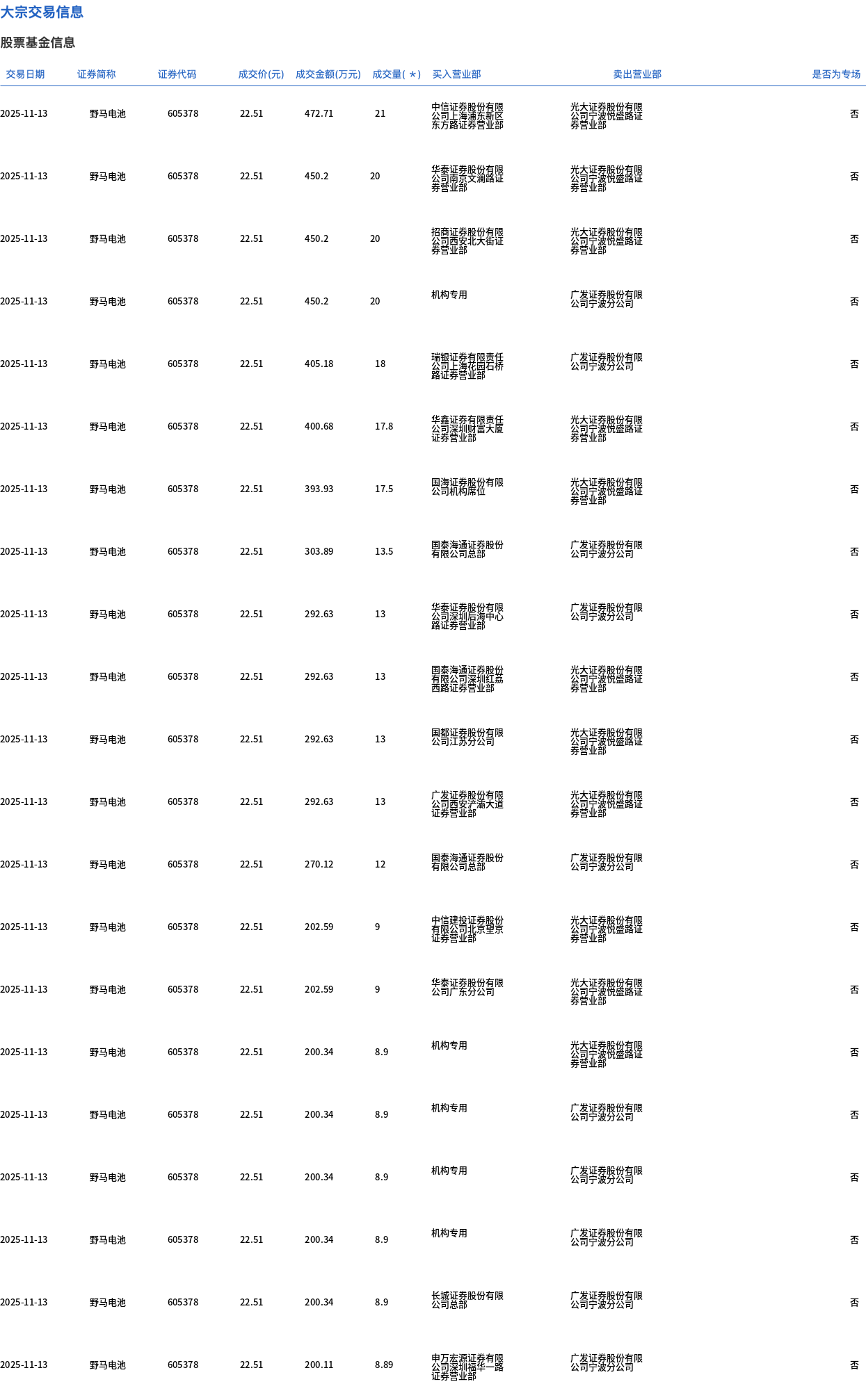 野马电池今日大宗交易折价成交283.19万股 成交额6374.62万元