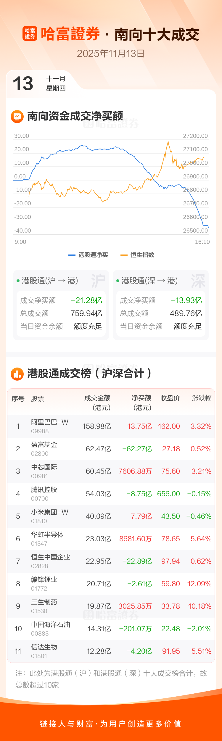 恒生指数11月13日涨0.56%,收报27073.03点。南向资金今日净卖出港股35.21亿港元。南向资金今日成交额1249.69亿港元,港股大市成交2706.73亿港元。