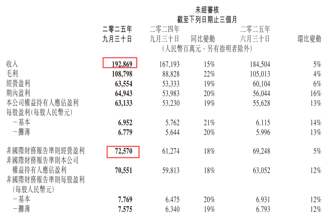 最新财报显示,第三季度营收达到1928.7亿元人民币,超出市场预估的1888亿元;净利润达631.3亿元,大幅超出预估的558.8亿元,环比增幅达13%,同比增幅为19%。