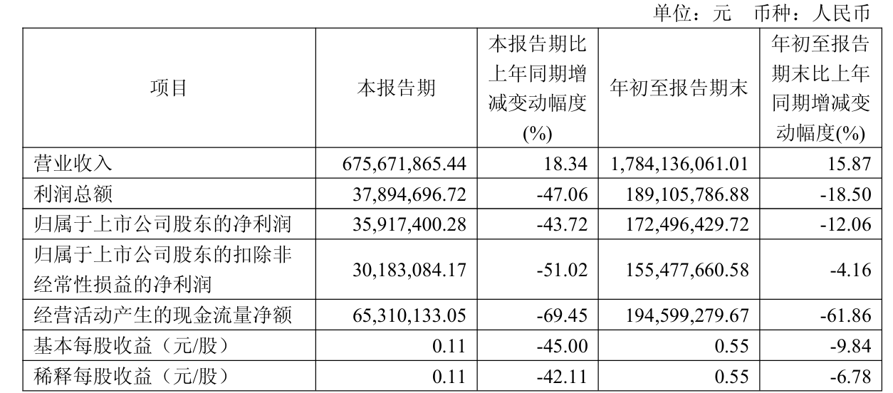 其中,第三季度,公司实现营业收入6.76亿元,同比增长18.34%;归母净利润为3591.74万元,同比下降43.72%。