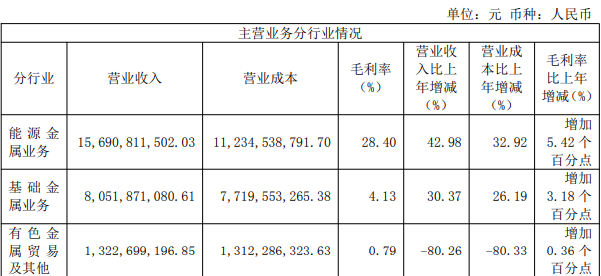 其中,能源金属业务是上市公司最主要的利润来源,但是综合毛利率亦不过28.4%,基本金属业务更是仅有4.13%。