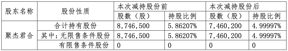 公司于2025年4月28日披露了《关于持股5%以上股东权益变动的提示性公告》及《简式权益变动报告书》。本次权益变动后,聚杰君合持有公司股份数量7,460,200股,占总股本比例为4.99997%,不再是公司持股5%以上股东。