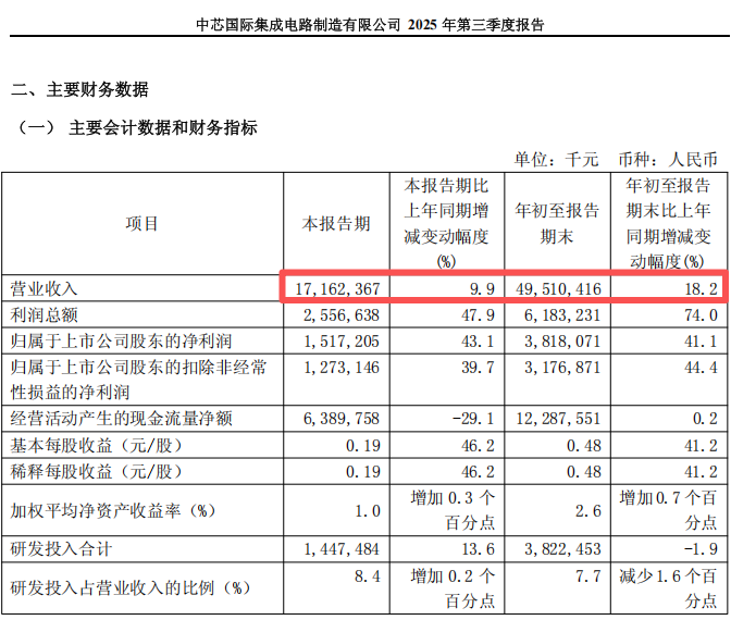 2025年第三季度,中芯国际的营业收入为171.62亿元,同比增长9.90%;归母净利润为15.17亿元,同比增长43.10%。
