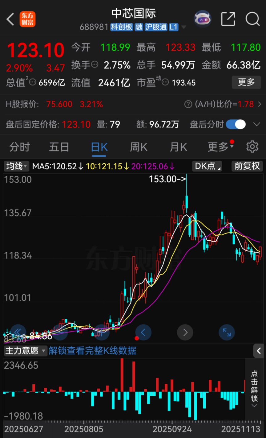 截至11月13日收盘,中芯国际A股股价报123.10元/股,涨幅为2.90%,总市值为6596亿元。