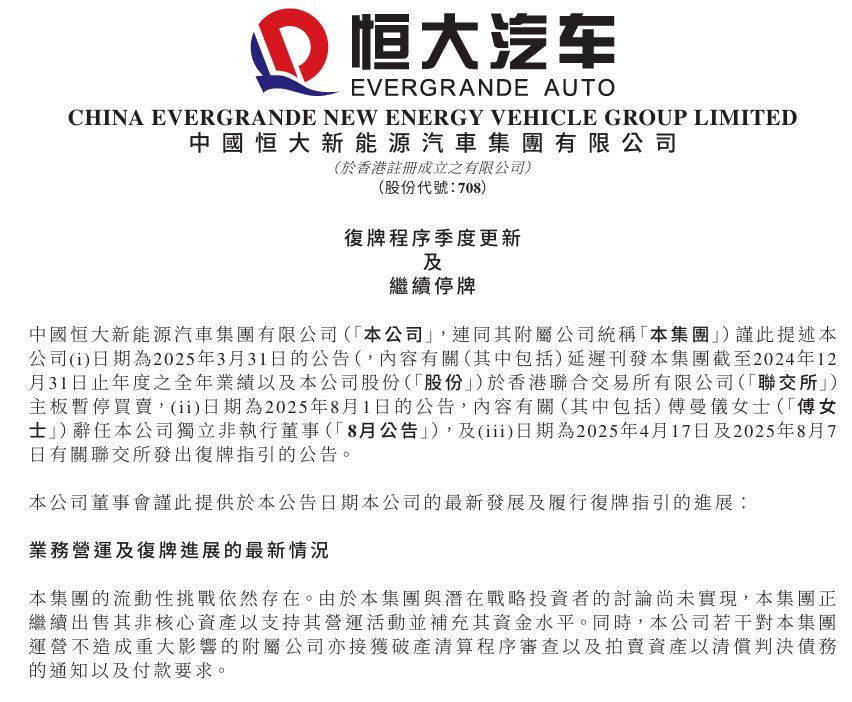 恒大汽车表示,当前流动性挑战依然存在,与潜在战略投资者的讨论尚未实现。