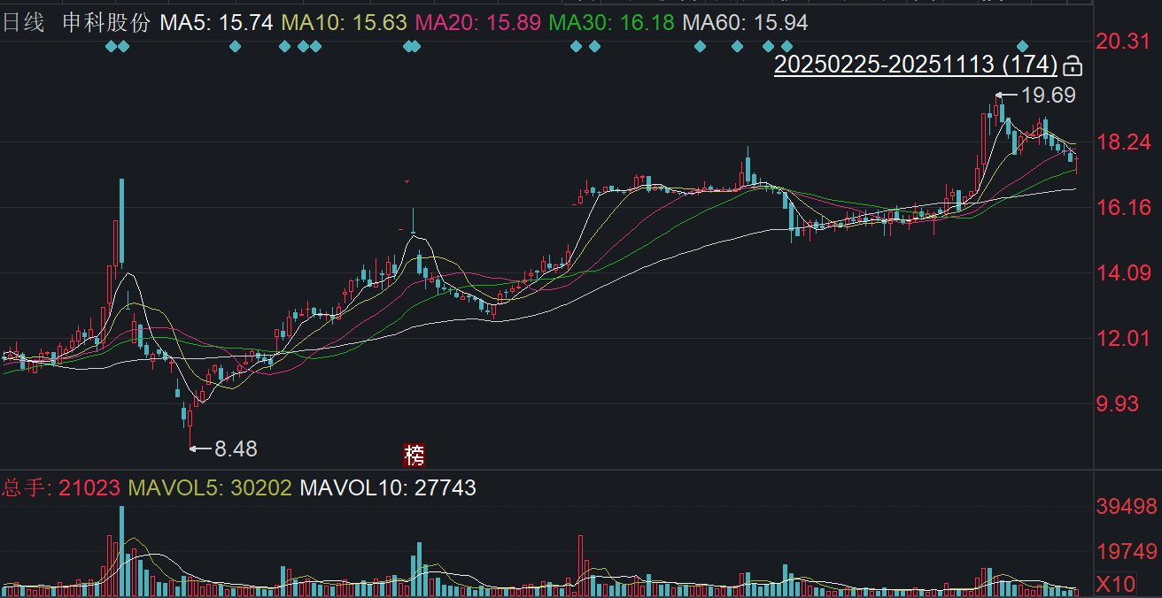 二级市场上,截至11月13日收盘,申科股份上涨0.63%报17.68元/股,总市值约26.52亿元,今年来公司股价累计上涨约64%。