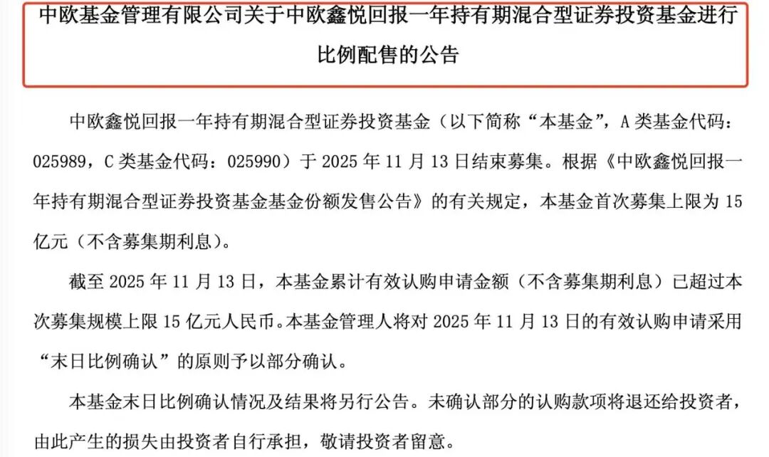 11月13日,中欧基金发布公告称,旗下中欧鑫悦回报一年持有期混合发行首日便达到15亿元募集上限,提前结束募集,并启动比例配售。