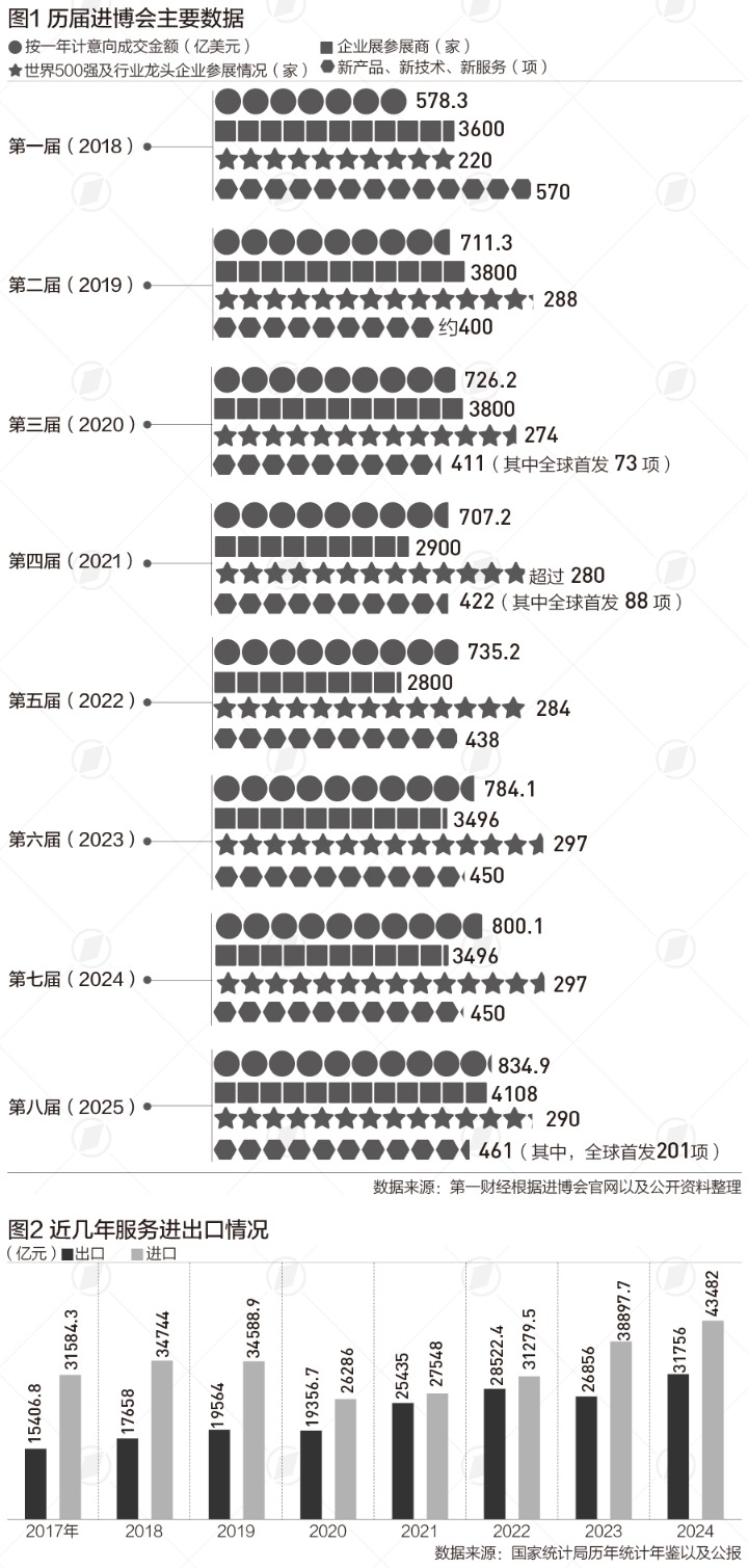 第一财经梳理8年间进博会相关数据发现,自2018年以来,按一年计意向成交金额由578.3亿美元增长到834.9亿美元,增幅44.4%;企业展参展商从3600家增加到4108家,增幅14.1%;参展世界500强及行业龙头企业由220家增加到290家,增幅31.8%;180家企业成为“八届全勤生”;8年来,已累计展示新产品、新技术、新服务超过3600件。