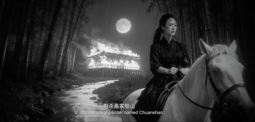 她在影片《大梦》中构建了三重世界,以一种环形叙事,探讨真实与梦境的边界。曾赠说,导演的工作就是造梦,这一次团队在画面设计中也发挥AI生成影像的特点,营造出一种梦境的感觉。比如短片中女刺客在竹林的画面,是经典武侠片的常见场景,曾赠为这个场景加上了雨、月亮,“这其实不符合现实逻辑,但很符合梦境的感觉。”