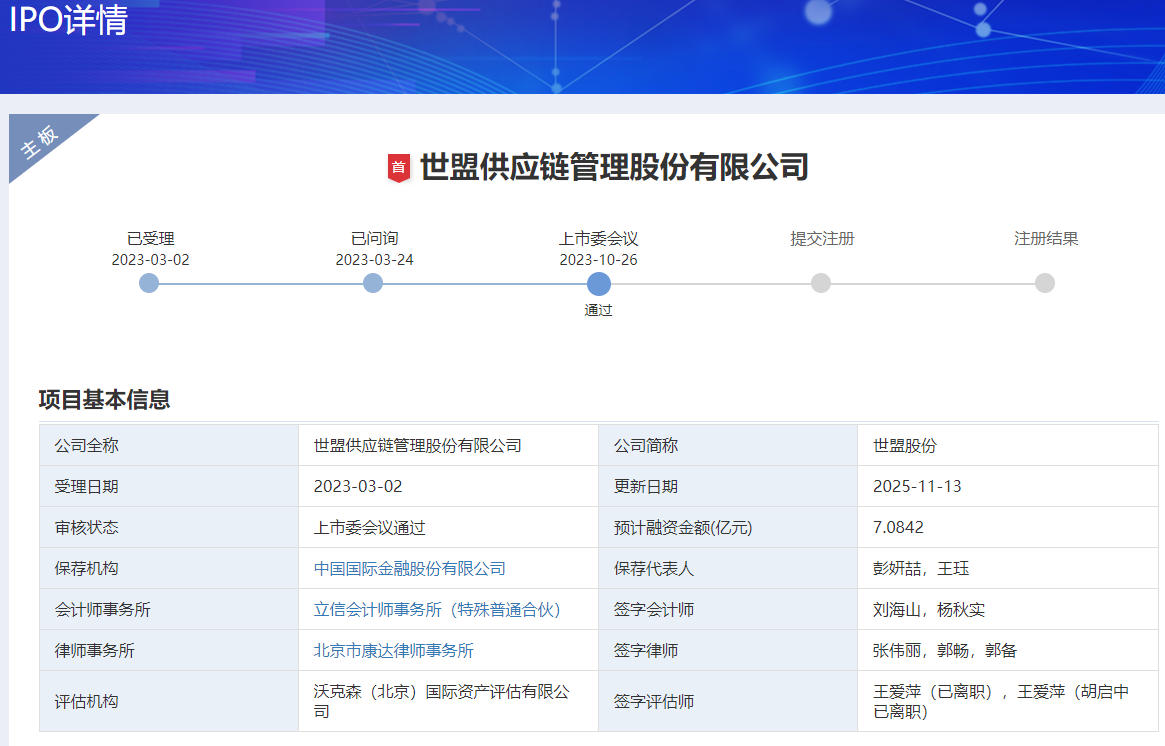 上市进程显示,2023年10月26日,世盟股份IPO获深交所上市委会议通过。重要节点为:2023年3月2日已受理,2023年3月24日已问询,2023年10月26日上市委会议通过。