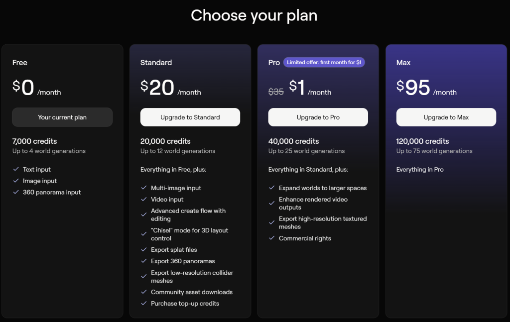在付费方面,Marble设有四大订阅计划。免费版用户每月能够通过文本、图片或全景图输入进行4次生成;标准版每月收费20美元,能够解锁多图和视频输入以及高级编辑,包含12次生成额度;专业版每月收费35美元,目前有首月1美元的优惠,在标准版之上增加了场景扩展功能与商用权限,生成次数提升至25次;最高级的Max版每月收费95 美元,生成次数提升至75次。