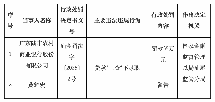 贷款“三查”不尽职,广东陆丰农商银行被罚35万元