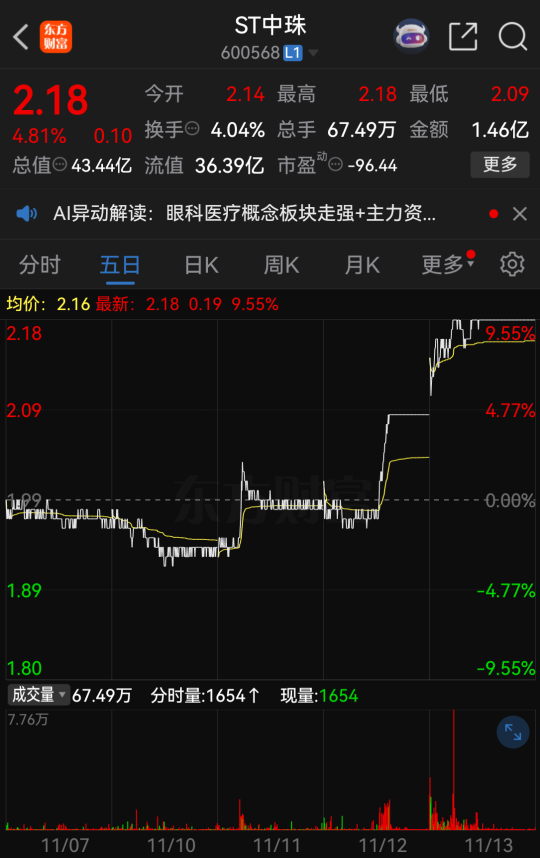 截至11月13日收盘,ST中珠股价报2.18元/股,涨幅达4.81%,总市值为43.44亿元。