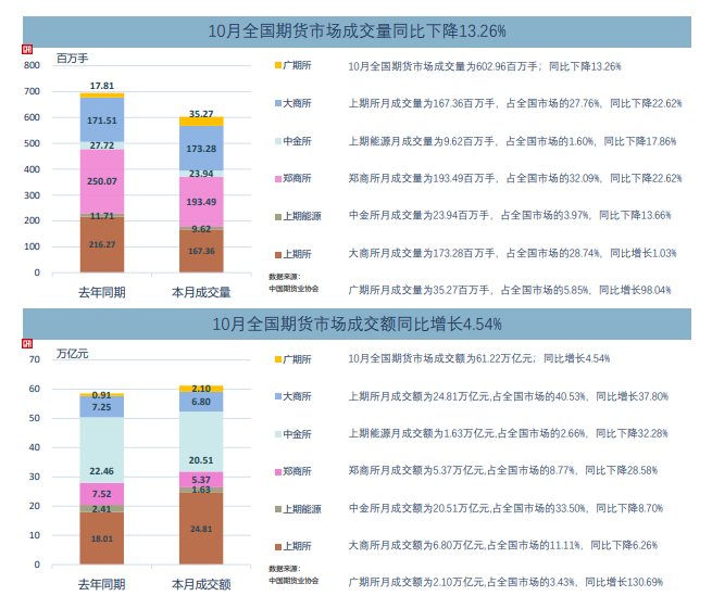 11月12日,中期协披露的最新全国期货市场交易情况简报显示,以单边计算,10月全国期货交易市场成交量为6.03亿手,成交额为61.22万亿元,同比分别下降13.26%和增长4.54%。