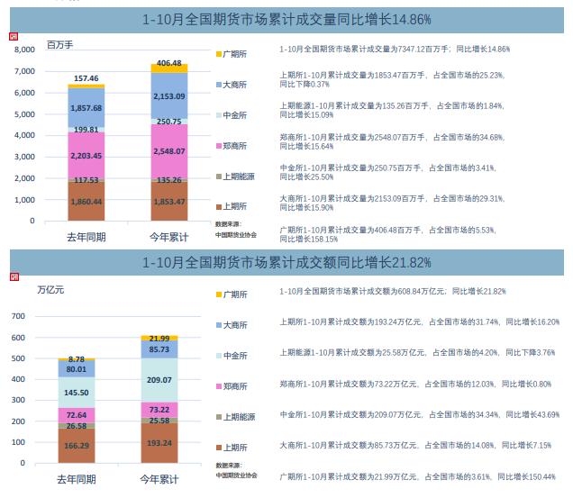 1至10月,全国期货市场累计成交量为73.47亿手,累计成交额为608.84万亿元,同比分别增长14.86%和21.82%。
