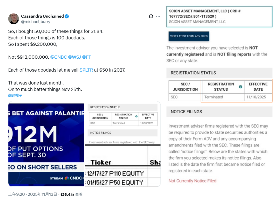 与此同时,SEC文件显示其旗下Scion Asset Management已于11月10日终止注册。
