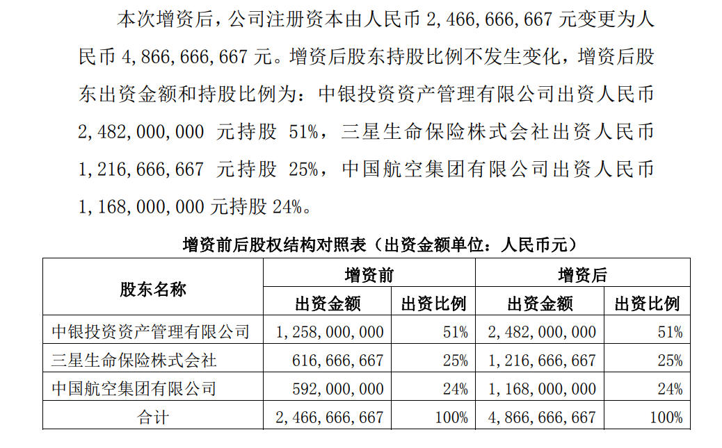 需关注的是,中航集团“出清”股权动作,或会对中银三星人寿正在推进的增资计划产生影响。2022年,中银三星人寿公告称,拟增加注册资本24亿元,中银投资、三星生命和中航集团按各自的持股比例出资。其中,中银投资出资12.24亿元,三星生命出资6亿元,中航集团出资5.76亿元。增资后,公司注册资本由24.67亿元变更为48.67亿元。该增资计划至今未落地。