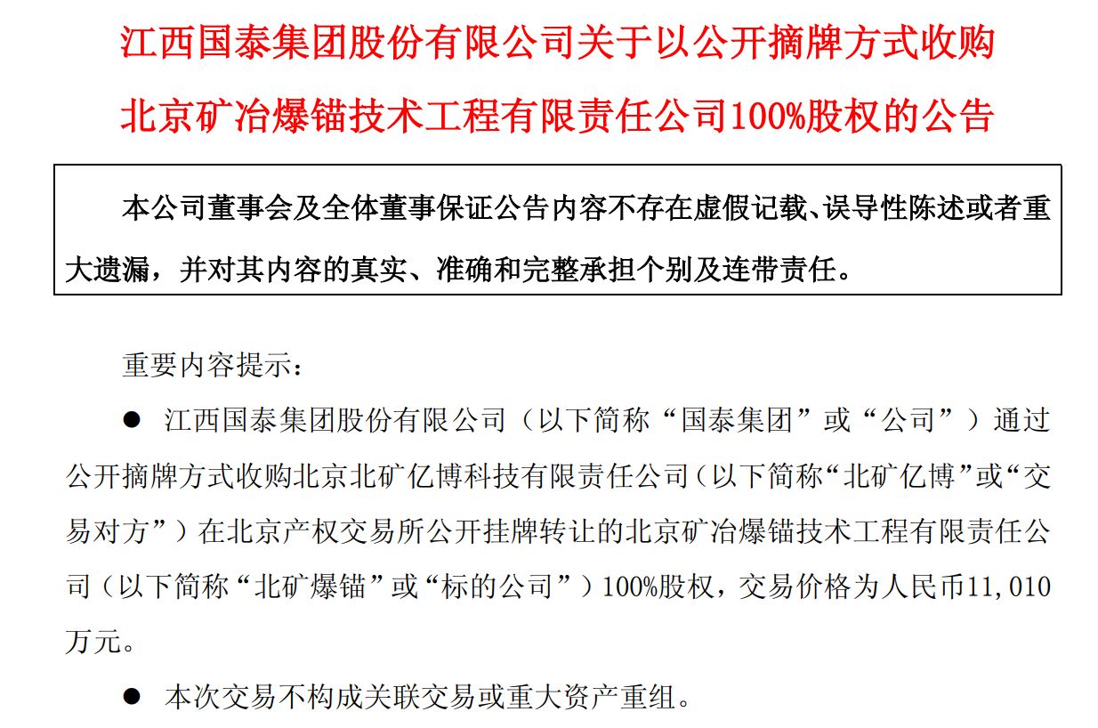 11月13日晚间,国泰集团公告称,公司通过公开摘牌方式成功收购北京矿冶爆锚技术工程有限责任公司(以下简称“北矿爆锚”)100%股权,成交价格为1.101亿元。