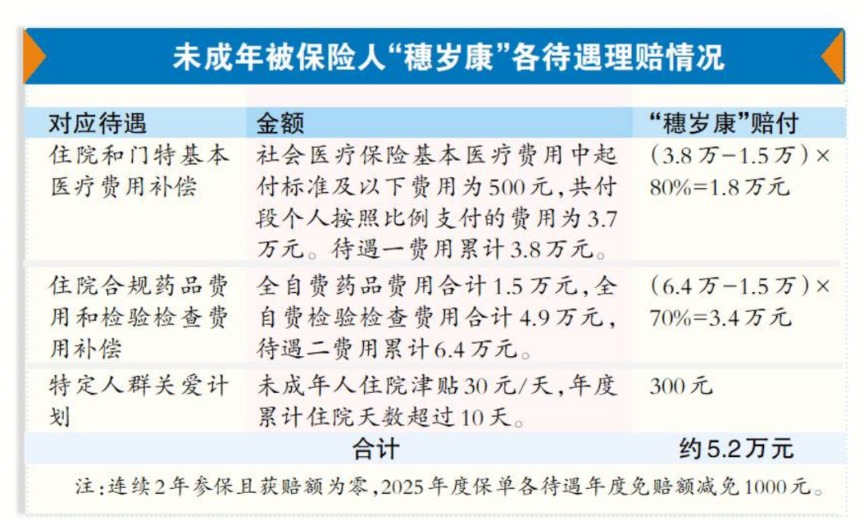 11岁的沈同学是广州市城乡居民医疗保险参保人,今年3月她被诊断为“创伤性休克”住院治疗,其间发生的总医疗费用为55.6万元。出院办理结算时,沈同学的家长发现医保已经报销了38.8万元,“穗岁康”同步结算报销5.2万元,他们个人支付部分为11.6万元。“穗岁康”项目相关负责人表示,沈同学连续2年参保了“穗岁康”,且获赔额为零,因此2025年度保单可享受各待遇年度免赔额减免1000元,获得更多赔付。此外,她年度累计住院天数超过10天,还获得300元的住院津贴。