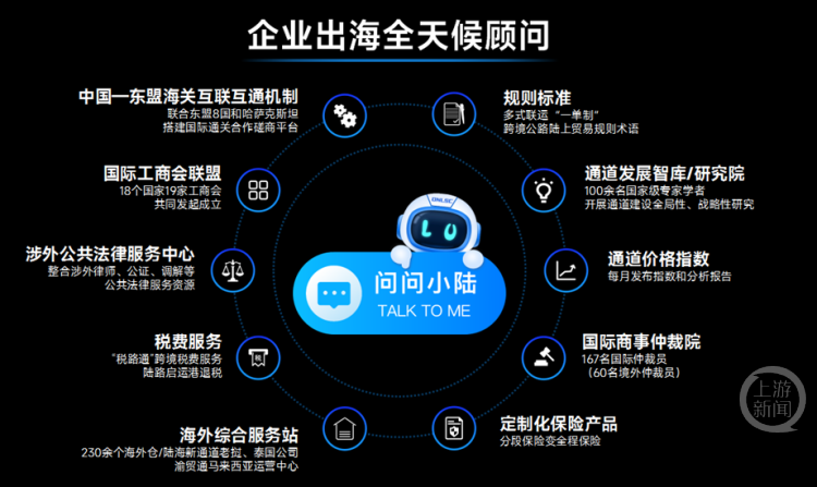 专业服务板块化身企业出海“全天候数字顾问”,通过建立中国—东盟海关互联互通联络员机制、国际工商会联盟等合作平台,组建涉外公共法律服务中心、国际商事仲裁院和通道智库,定期发布通道价格指数。依托“小陆”智能体,整合法律、税务、海外风险防控等服务资源,推出“税路通”跨境税费服务、定制化保险产品等,为企业出海扫除合规障碍。