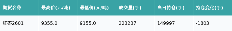 南财智讯11月13日电,南财金融终端盘后期货数据显示,郑州商品交易所的红枣主力合约收跌2.6%,收盘报9195.0元/吨,日内资金流出3814.61万元。其他相关指标见下表: