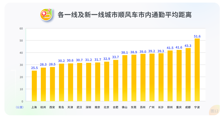 各一线及新一线城市顺风车市内通勤平均距离,最短前五依次是上海25.5公里、杭州28.3公里、西安28.5公里、青岛30.2公里和天津30.6公里。