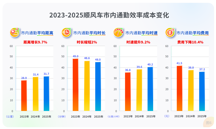 2023至2025年,尽管顺风车市内通勤平均距离逐年增加,从28.9公里增至31.7公里,但平均订单时长逐年缩短,从49分钟到48分钟,平均时速从36.8公里提升至40.2公里。